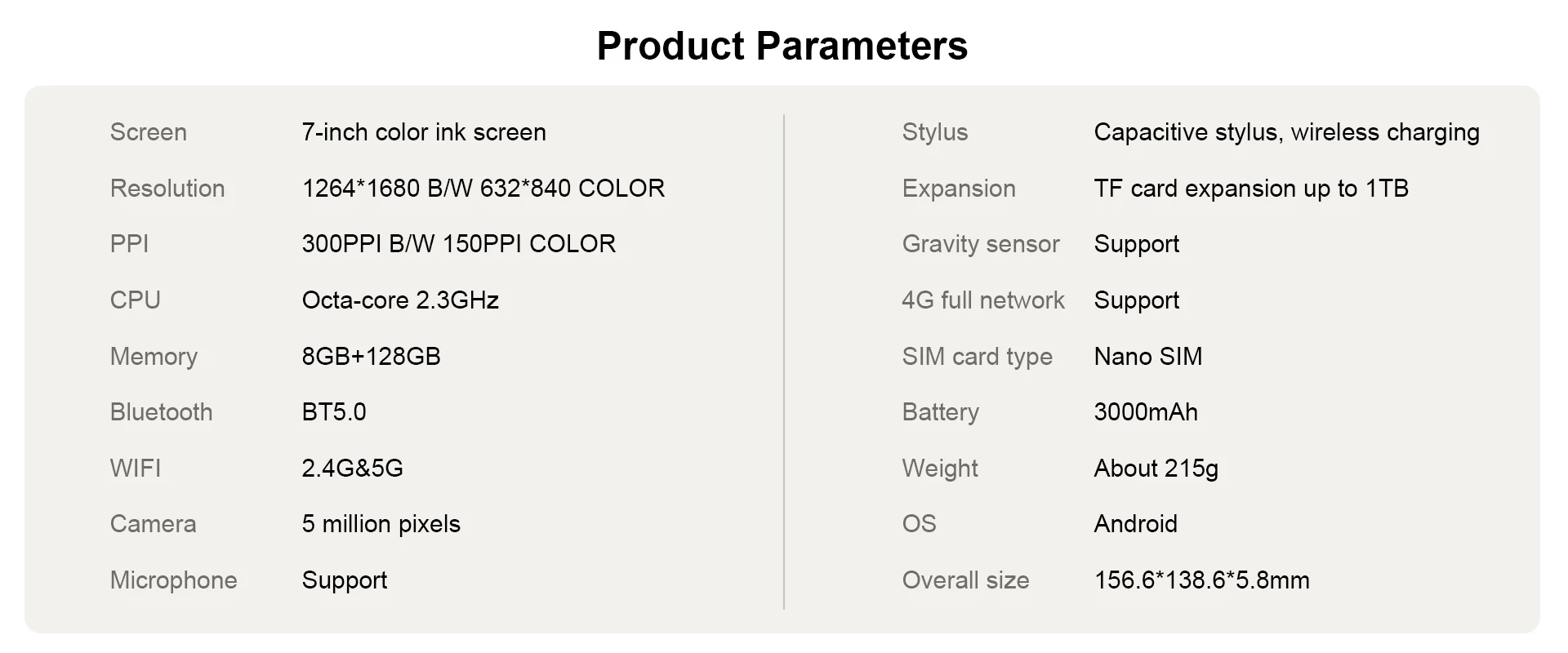 The Bigme B7 is powered by an octa-core 2.3GHz processor, ensuring smooth multitasking and responsive app performance for productivity and entertainment. It pairs this with 8GB RAM and 128GB of internal storage, expandable via microSD for additional space, catering to users who need ample room for documents, apps, and media.