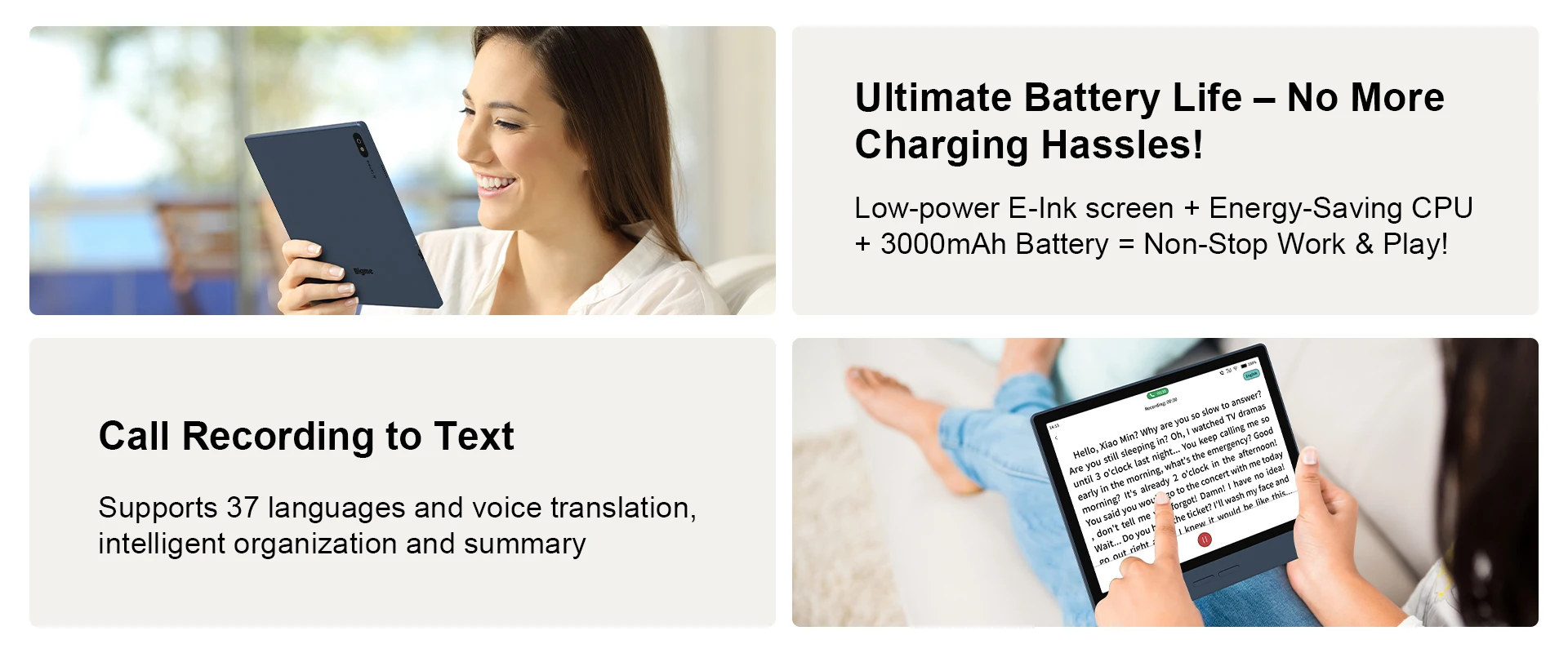 Low-power E-Ink screen + Energy-Saving CPU + 3000mAh Battery = Non-Stop Work & Play!