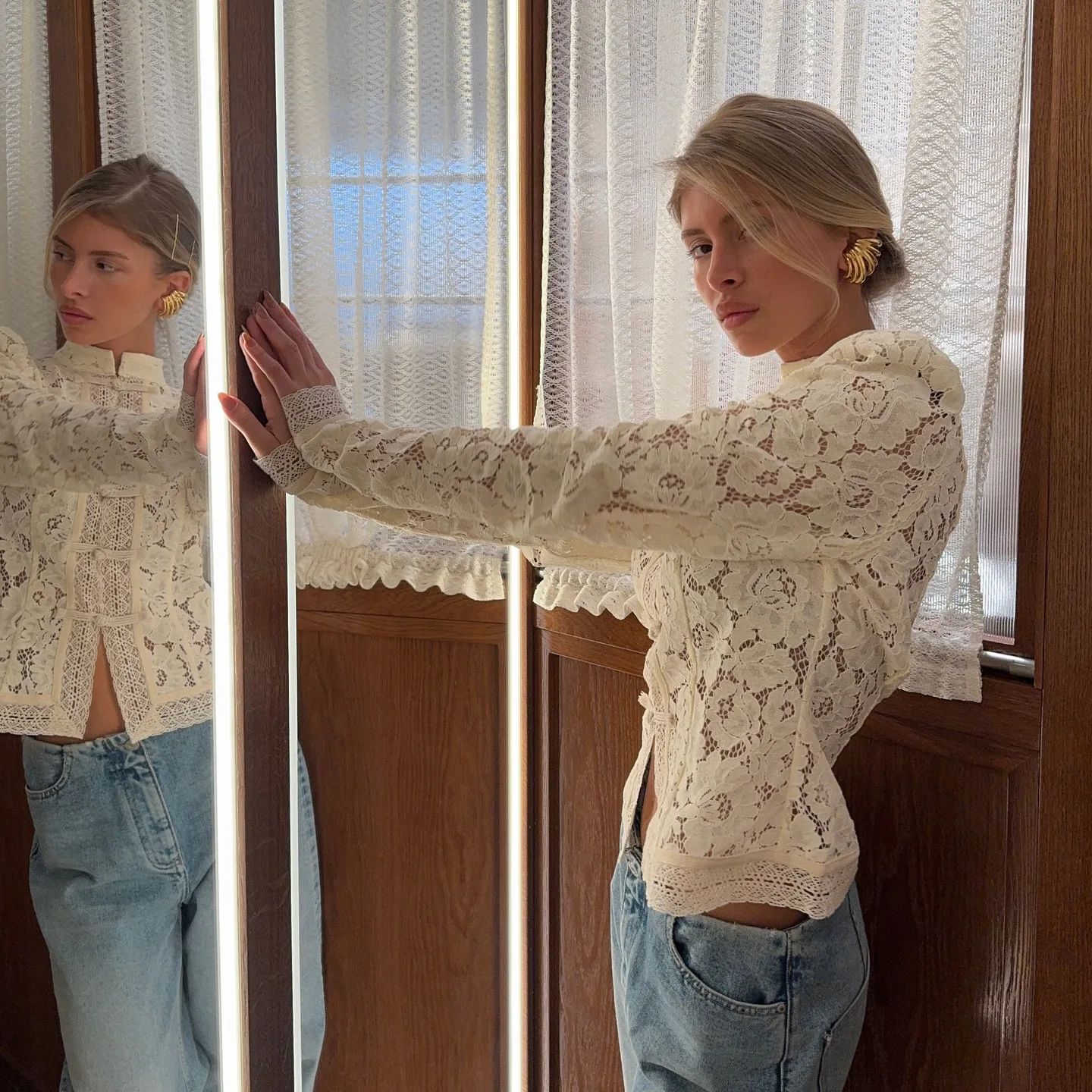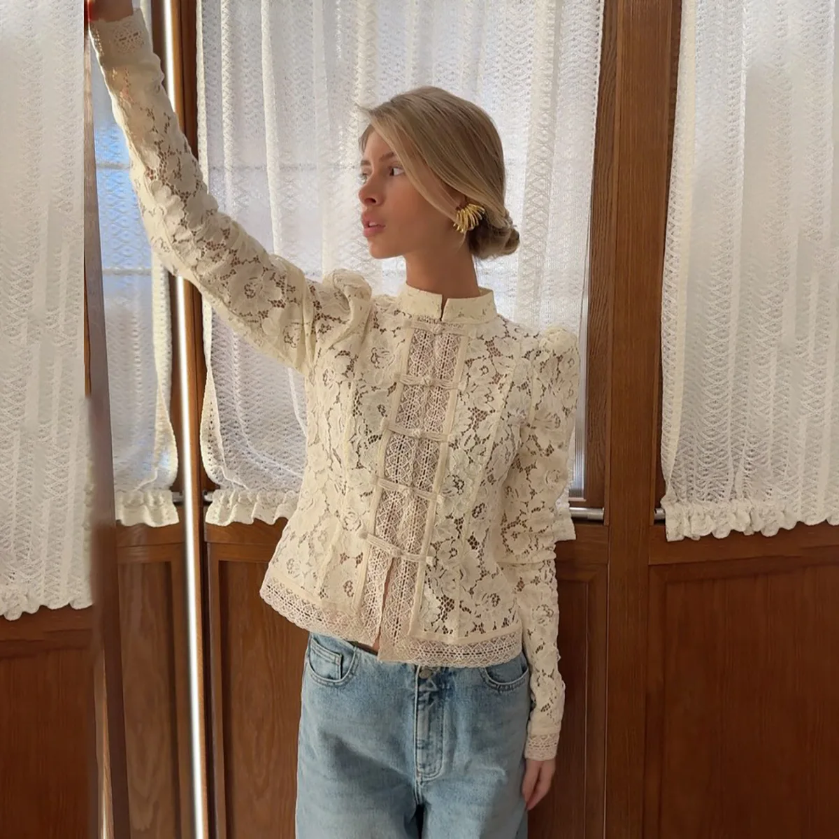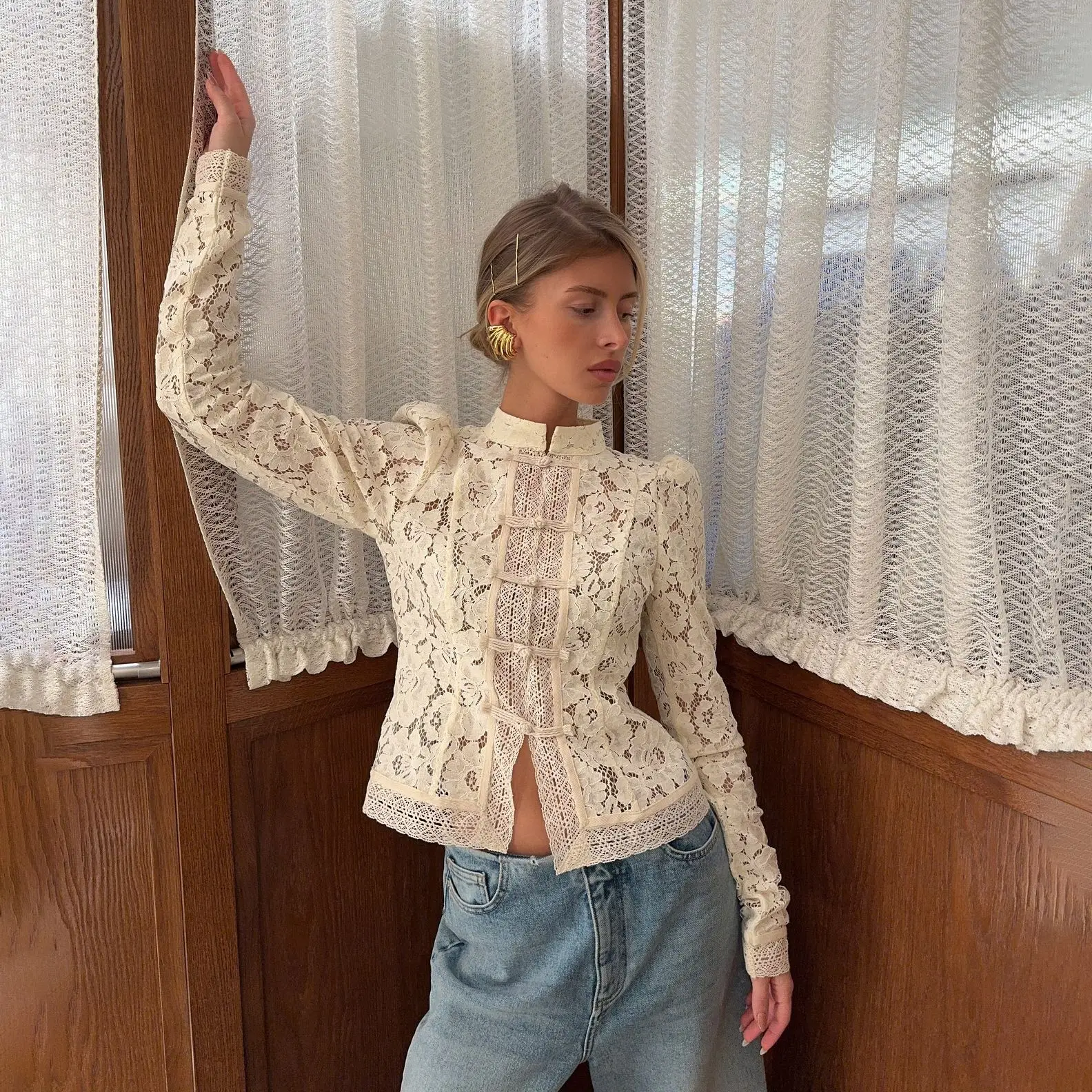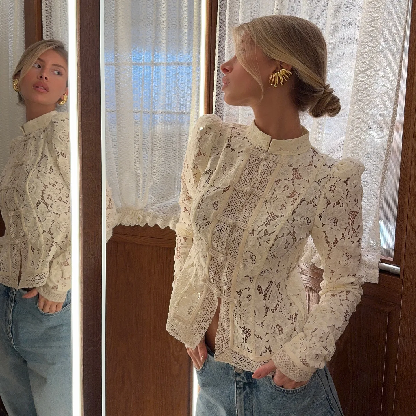 Elegant Embroidery Puff Sleeve White Shirts Summer Sexy Hollow Out Lace Blouse Casual Sand Collar Top 2025 Vintage Shirts