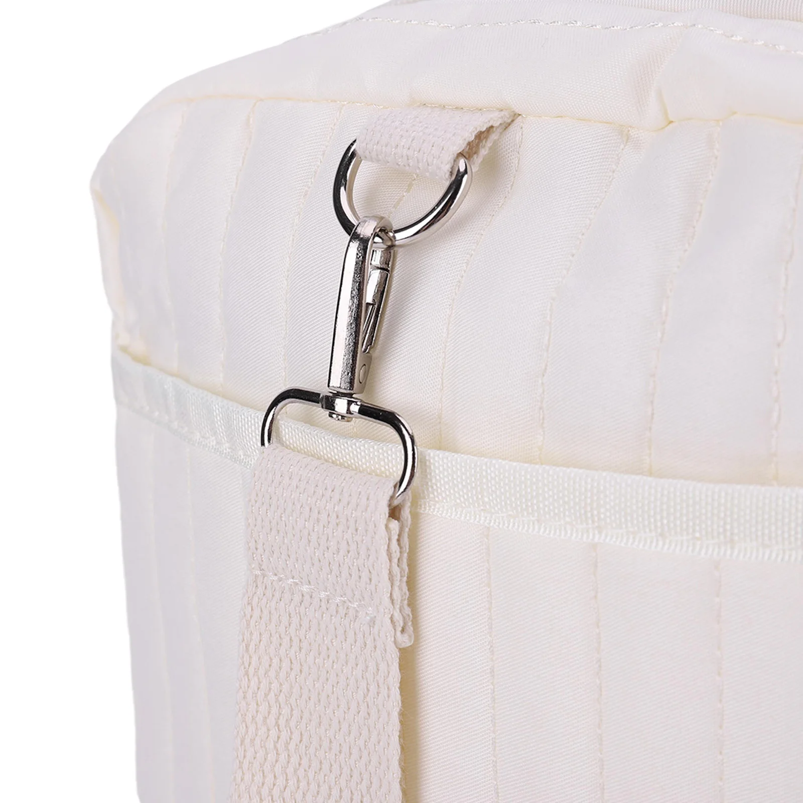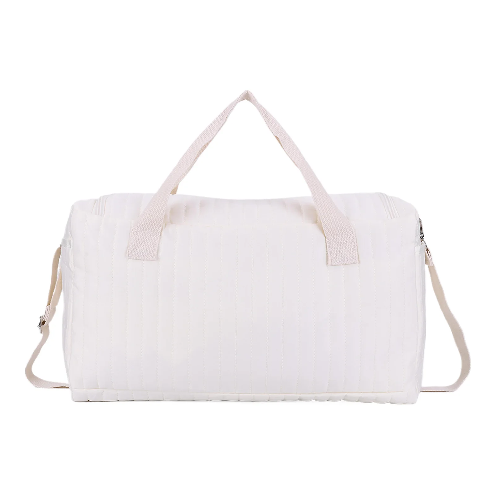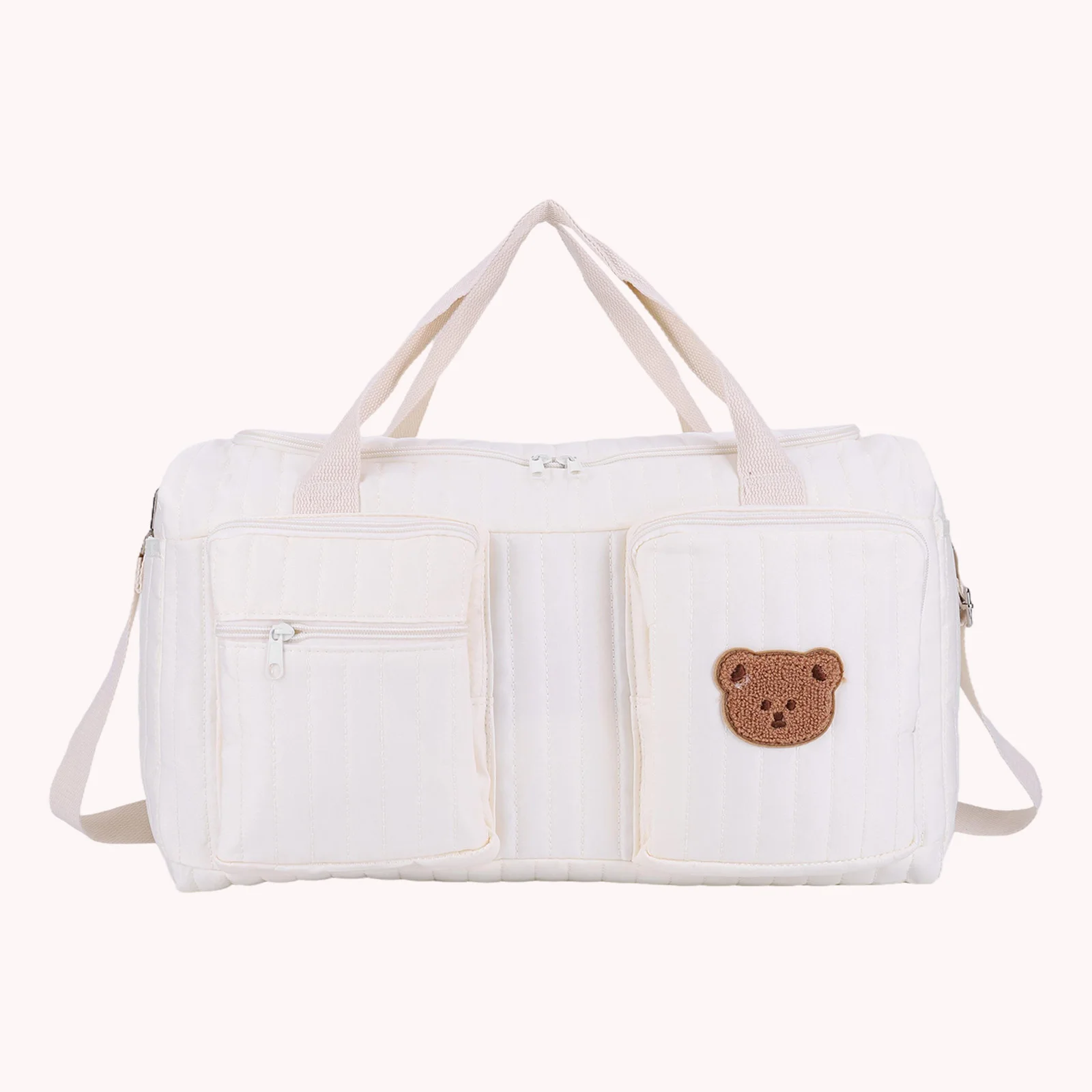 A quilted cotton diaper bag built for moms on the move, pairing roomy storage with everyday comfort for hospital stays and weekend getaways.