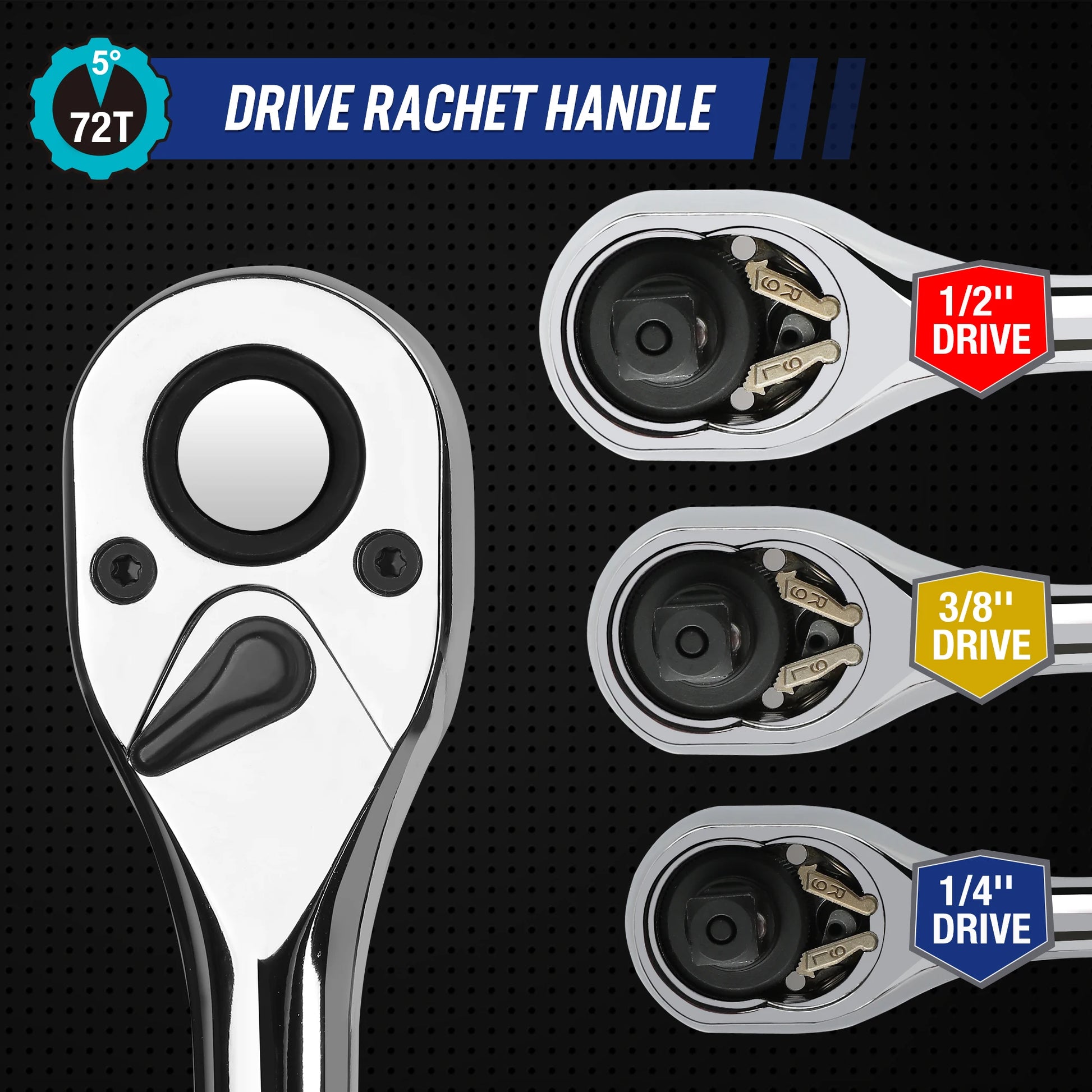 - Versatile drive set: Includes 3 drive ratchet handles, 73 sockets in Metric & SAE, and a 3-inch extension bar for hard-to-reach fasteners.