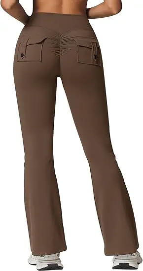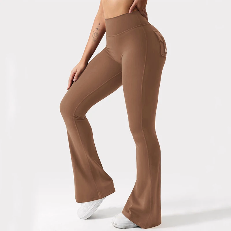 High-waisted styles lift the waistline, visually elongating the leg proportions. The flared silhouette gradually widens below the knee, effectively smoothing calf contours to create a more slender and balanced leg appearance, offering a flattering effect on leg shape. The fabric used typically offers excellent stretch, ensuring a comfortable, unrestricted fit. These pants pair seamlessly with athletic tops for yoga, workouts, and similar activities, while also complementing casual tops for everyday wear.